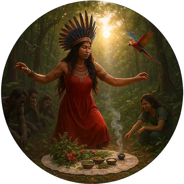 In the heart of a sacred forest glade, a radiant Indigenous woman moves in a powerful, trance-like ceremony of healing. Before her, a round cloth is laid with sacred herbs, vibrant flowers, and ritual offerings. Wisps of incense smoke rise gently, carrying silent prayers to Pachamama, the great Earth Mother.