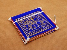 These handmade paper prayer flags feature gold block-printed mantras, prayers and auspicious symbols. Used in Nepal to promote compassion, peace, strength and wisdom, they are traditionally hung outdoors where the wind can carry their blessings far and wide. As the paper naturally fades and wears, it symbolises the impermanence of life. Tibetans may burn old flags to release the prayers or add new ones to honour the cycle of renewal. Each set is strung as bunting and ready to hang. Detailed information below in the description. Dimensions: 25 flags measuring 6,5 x 6,5 cm. Length of bunting: 258 cm. |