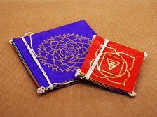 This long decorative chain is handmade in Nepal from colourful Lokta paper, with each flag printed in gold with one of the seven Chakra symbols. The Chakras are energy centres linked to different aspects of wellbeing and spiritual awareness. Red represents grounding, orange creativity, yellow willpower, green compassion, blue truthful expression, indigo insight and violet spiritual connection. Perfect for meditation areas or quiet corners, these flags bring a subtle reminder of balance and presence. Detailed information below in the description. Dimensions: 21 flags measuring 6,5 x 6,5 cm. Length of bunting: 229 cm. |