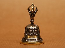 This traditional Tibetan brass bell is topped with a Vajra handle and decorated with symbolic detailing around the base. Used in ceremonies to clear energy and support meditative focus. More information can be found below. Dimensions: 5 x 2 cm. |