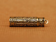 A compact brass pendant with decorative Tibetan-style script and a row of Dorje symbols encircling the base. The screw-top lid opens to reveal a small hollow compartment for precious contents or sacred items. More information can be found below. Dimensions: 4 x 1 cm. Cord not included. |