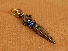 Miniature brass ritual Phurba with a small loop for hanging or decoration. Symbolic dagger used to subdue negativity and anchor intention. Features a stylised head at the top, short grip, and three-sided blade tapering to a point. Warm golden tone with darker recessed detail. Compact yet defined for altar use or carrying. Detailed information can be found below. Dimensions: 5,3 x 1 cm. |
