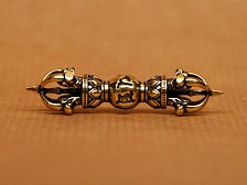 A small brass ritual object symbolising the indestructible truth of enlightenment. The central sphere links two symmetrical ends, each with a Lotus base and five prongs. Four curve inward to meet at the tips, enclosing the central prong. Warm golden tone with darker carved recesses. Comfortable to hold for meditation or display on an altar. Detailed information can be found below. Dimensions: 5,5 x 1,5 cm. |