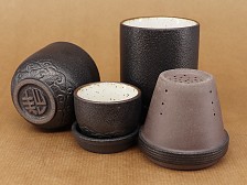 Ceramic Chinese tea set, available in black or red. Perfect for our extensive selection of Pu'er tea. Strong Pu'er tea is served steaming hot from very small ceramic cups. The tea is usually stewed in another pot and then served with a small ceramic teapot.Serves 8 cups of 15 ml. Set contains 1 tea pot and 6 cups. |