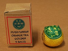 Orange Pu'er is a specific type of tea, combining the refreshing fragrance of "Xinhui" citrus fruit with the aged flavour of palace ripened Pu-er tea. Produced in Jiangmen City in the Guandong provence in China. Clementines are hollowed out and filled with Pu'er tea, then aged. The Pu'er tea leaves thus obtained when steeped, have a zesty orange smell and the tea is smooth and malty with hints of orange. |