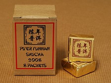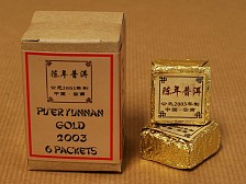 Yunnan Pu'er Gold from 2003, in a little gold-wrapped block. Pu’er or Pu'er tea (pronounced ‘poo-air’) is a highly prized and popular fermented tea produced in the Yunnan province of China. It is renowned both for its purported health benefits and because it is aged, in some cases for many decades to develop its depth of flavour. |