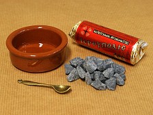 The beginners set for burning aromatic herbs and incenses, on charcoal. This set includes a roll of self igniting charcoal tablets, a small ceramic bowl, and a small spoon. |