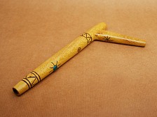 Quillabordón Wood · Sun Motif. This handcrafted single-channel Tepi is carved from one continuous piece of Quillabordón wood, known for its light golden tone and fine grain. The surface is decorated with a sun motif, applied through careful carving and pyrography. A slice of Caapi (Yagé) vine and a small semi-precious stone, typically Chrysocolla, are set into the wood. Measuring approximately 20 cm on the long side and 8 cm on the short side, with a 0.8 cm nostril opening, this Tepi offers a strong, controlled blow and balanced handling. More information can be found below. |