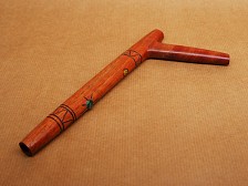Cumaceba Wood · Sun Motif. This single-channel Tepi is crafted from Cumaceba wood, a denser Amazonian hardwood with a deeper reddish-brown tone and a solid feel in the hand. The piece is carved from one continuous section of wood and decorated with a sun motif, applied through pyrography and carving. A Caapi (Yagé) vine slice and a small semi-precious stone, usually Chrysocolla, complete the design. Its proportions—20 cm long, 8 cm short, 0.8 cm opening—allow for a strong, focused airflow. More information can be found below. |